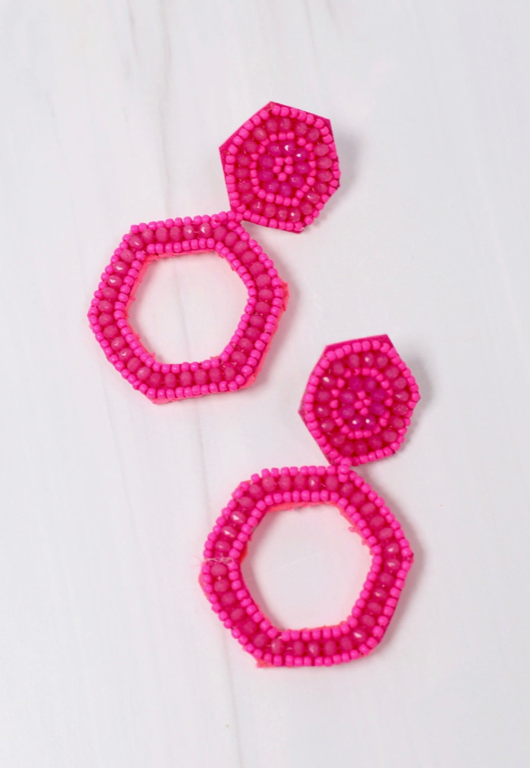 This bright statement earring features an open hexagon drop that is lined with beading. There is also a matching hexagon post that is beaded as well.