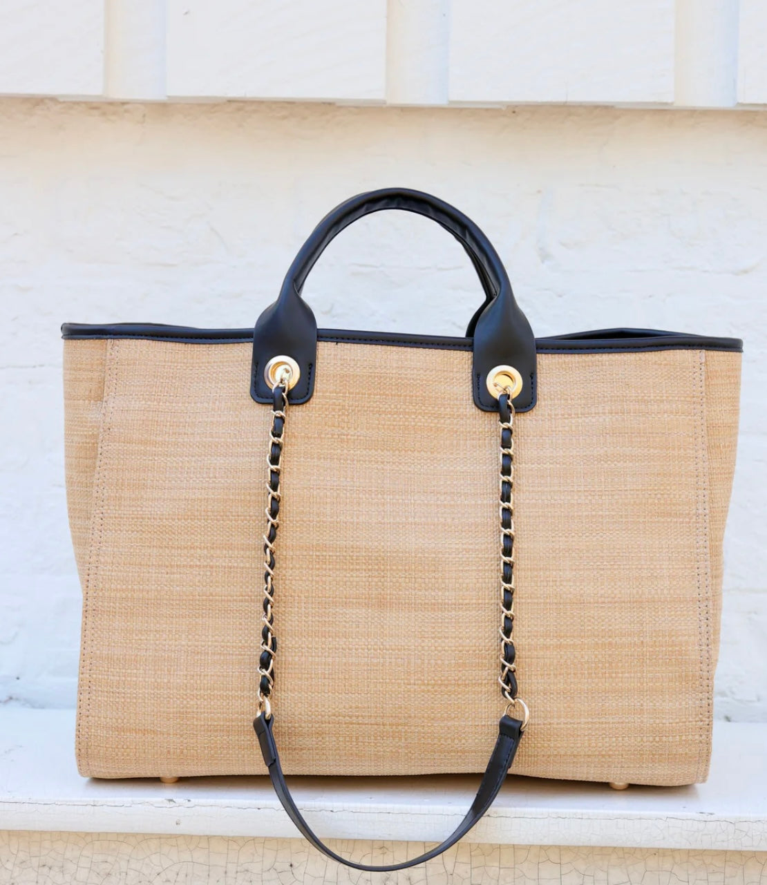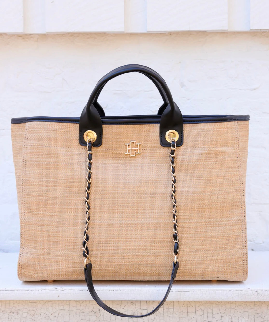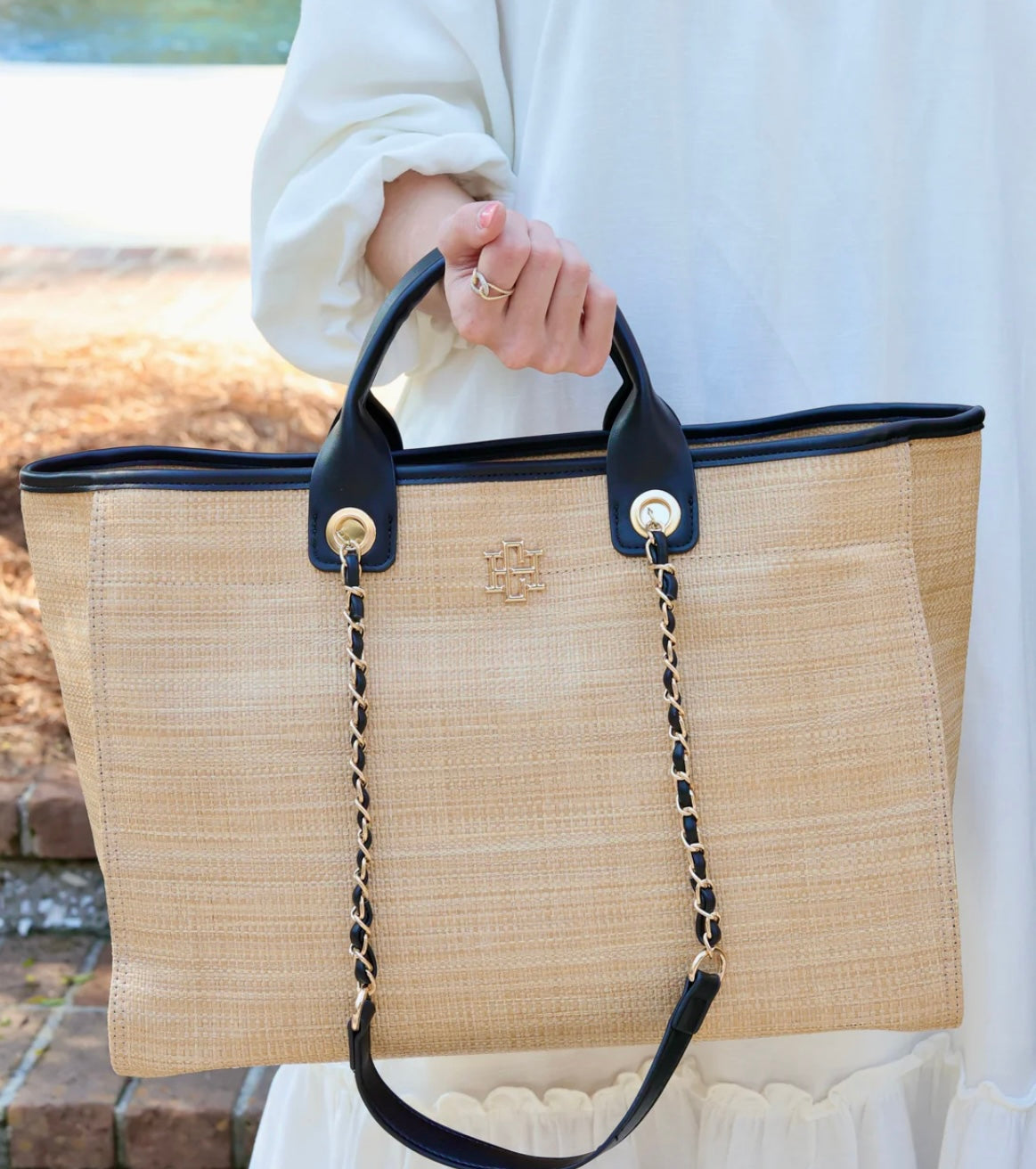 This oversized straw tote is the best go-to handbag! It has two short top handles as well as two elongated braided handles to carry on your shoulder. The Caroline Hill logo is centered at the top of this bag on one side. It has a magnetic closure leading to the roomy interior of the bag. It has one zippered pocket and two open pockets inside. There are also feet on the bottom of the bag for added protection. It's the perfect size for travel, carrying a laptop, or for everyday fashion.