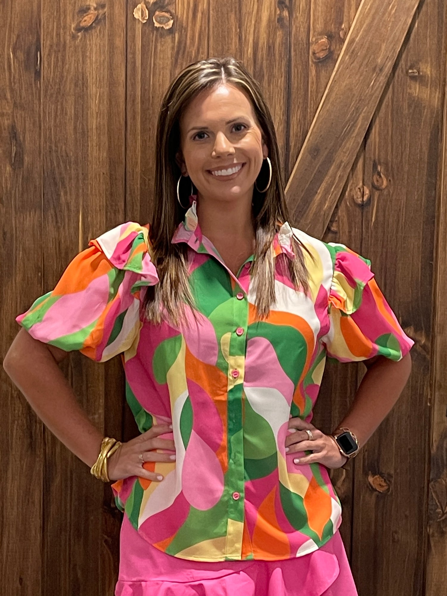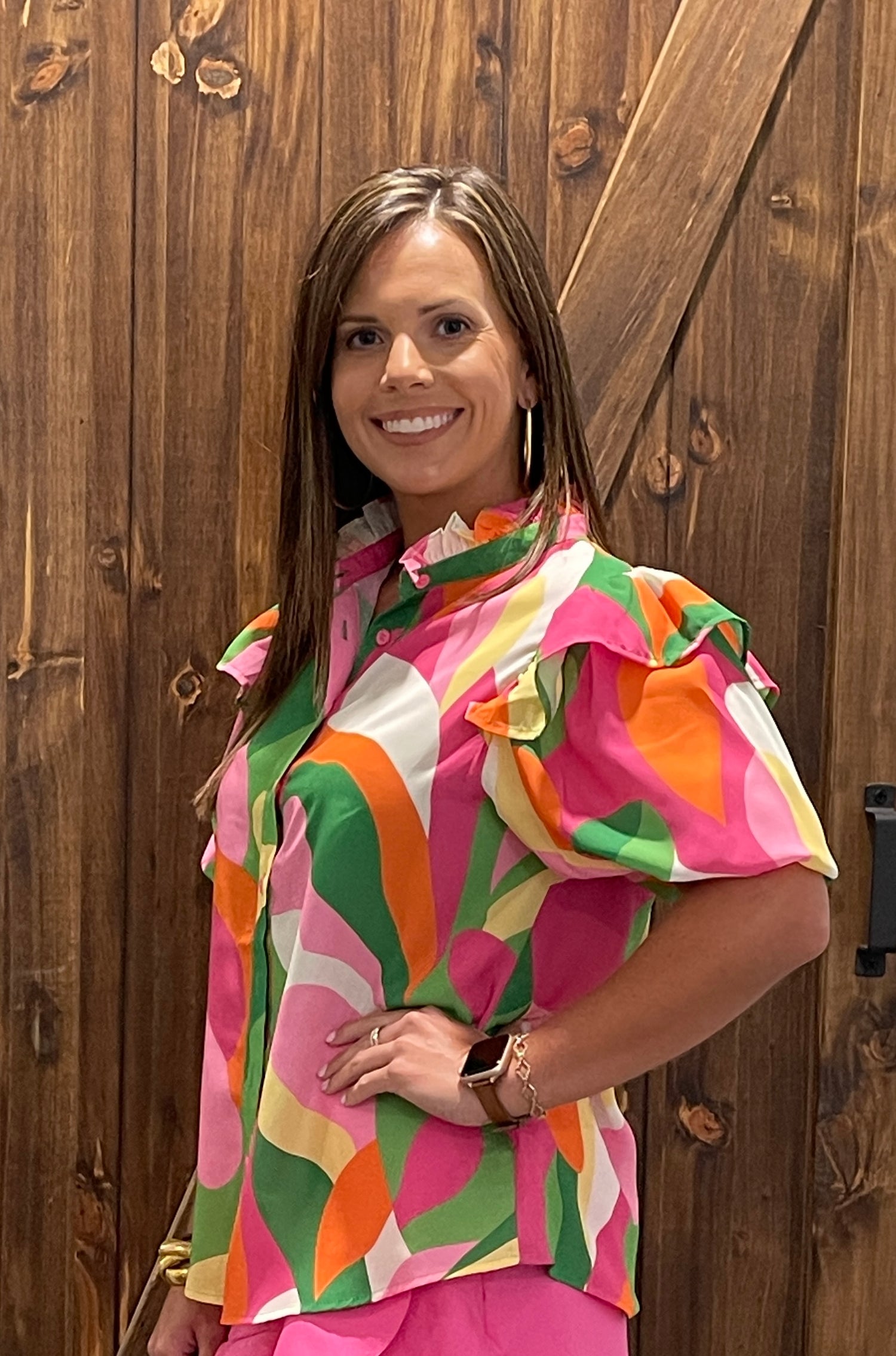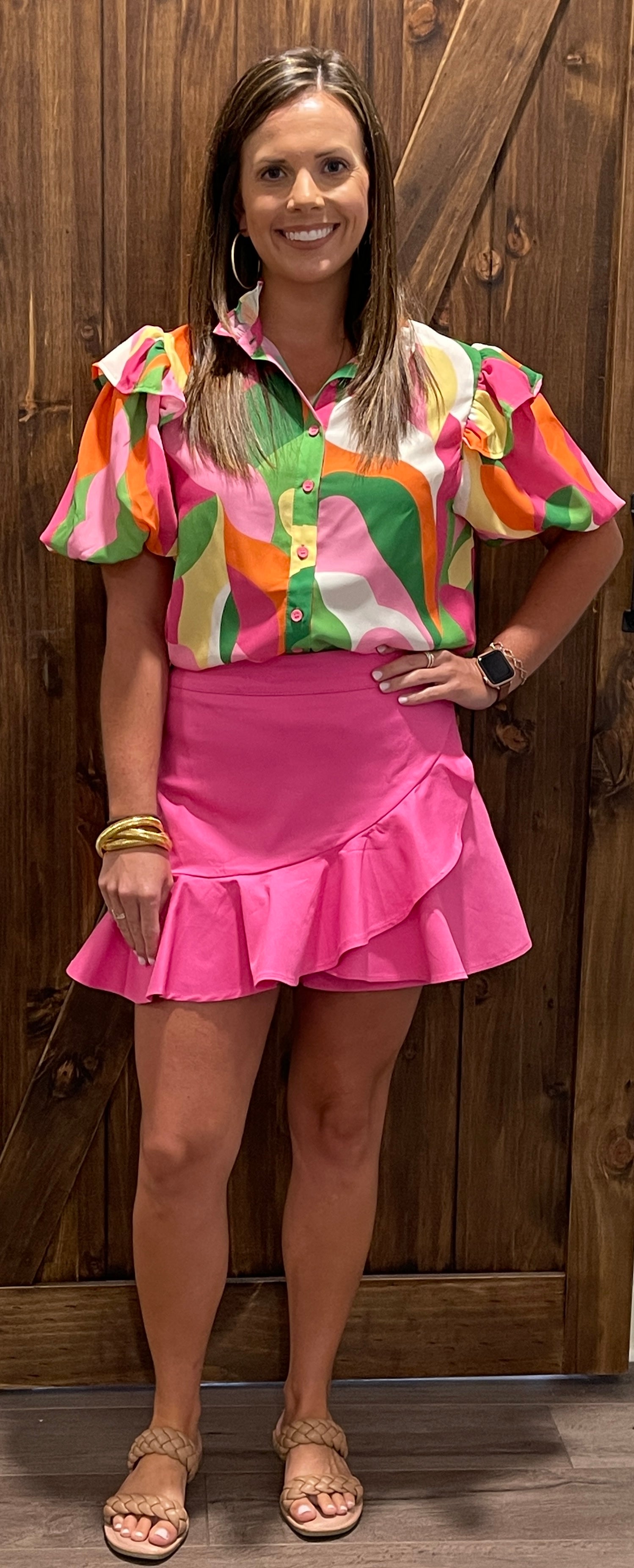 Perfect to throw on after a day at the beach, this woven top is all about island vibes. Featuring a high neckline with ruffle edge, short puff sleeve with ruffled top and button down, this style is sure to be your new favorite. I have it paired with the Twill Skort in pink!