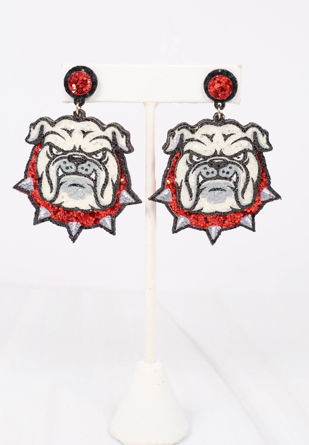 This earring will make you want to yell 'Go Dawgs!' It features a bulldog with spiked collar and a glittered finish. It is on a glittered post back as well.