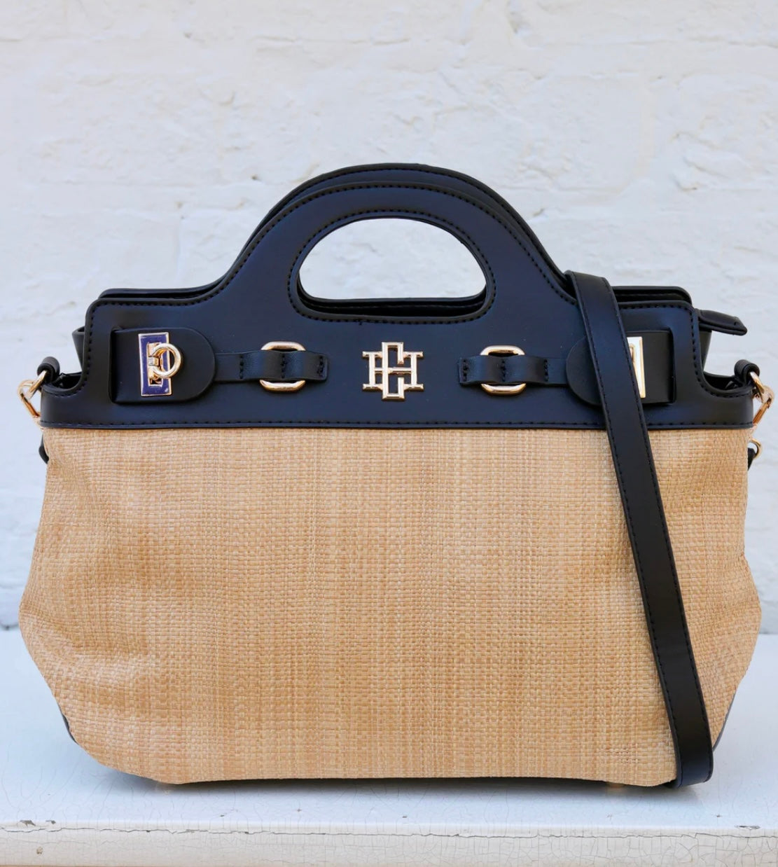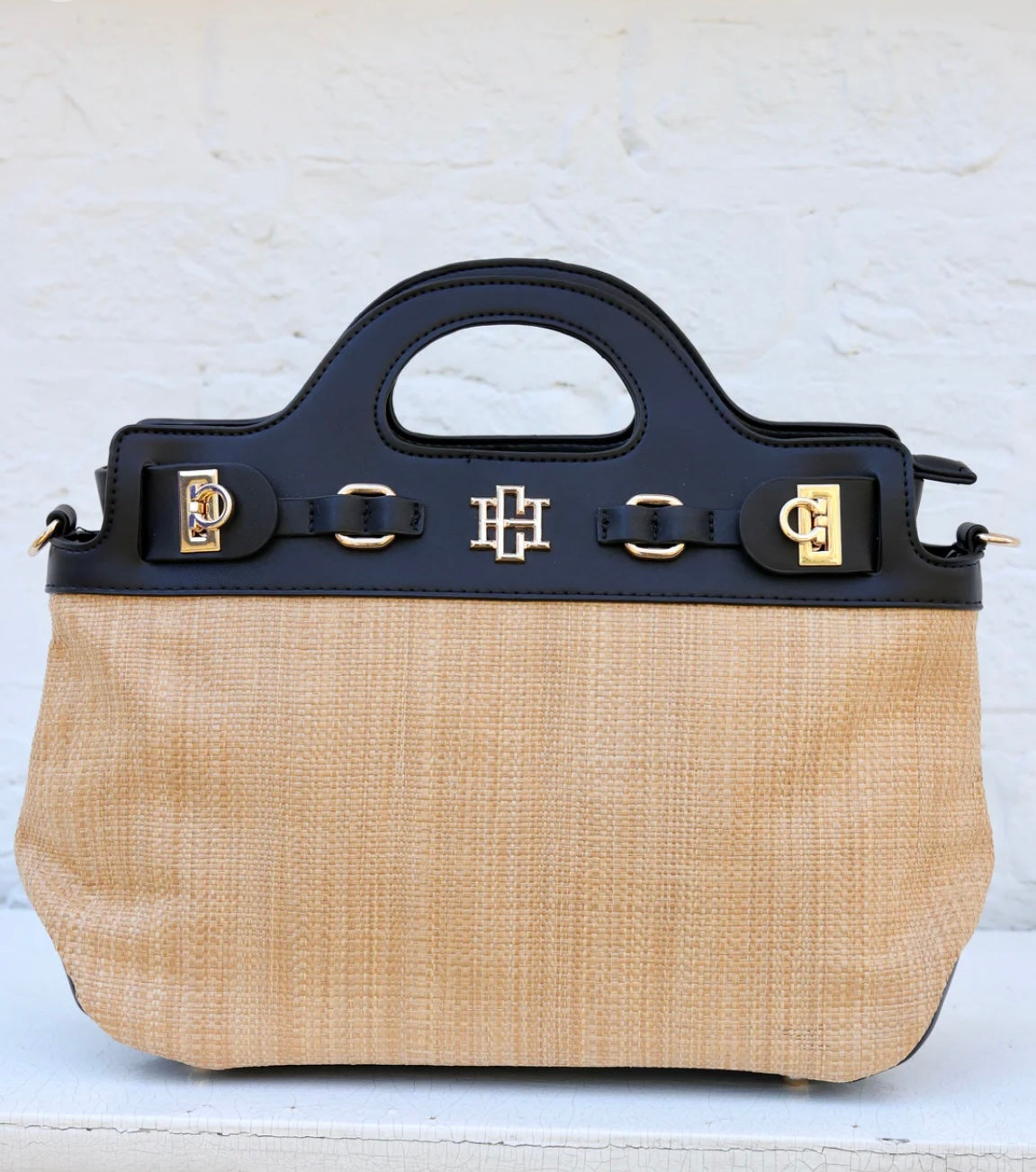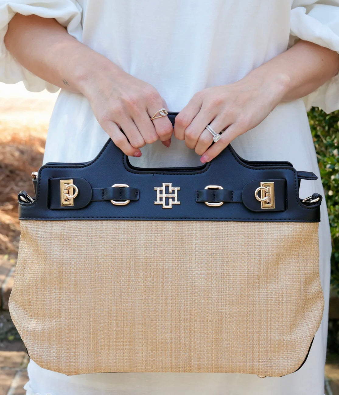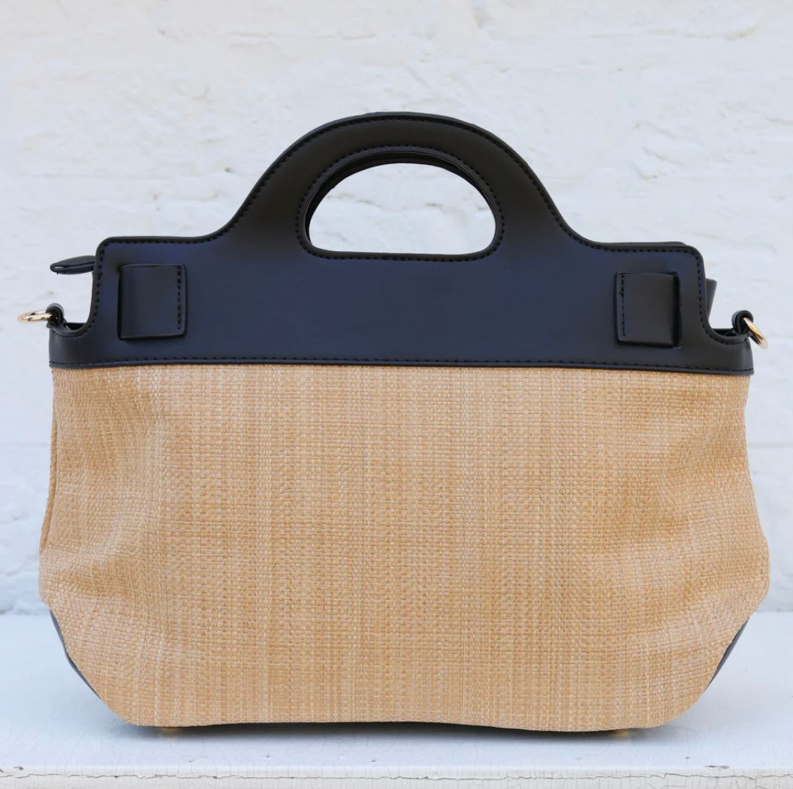 This modern handbag has a classy yet trendy silhouette. It is designed with a straw fabric with a vegan leather trim. There are two open top carrying handles as well as a removable and adjustable crossbody strap. The accent gold hardware adds a fashionable touch that elevates the whole look of this bag as well. The top zipper closure leads to the open interior with one zippered pocket and two open pockets. It also has feet on the bottom of the bag for added protection.