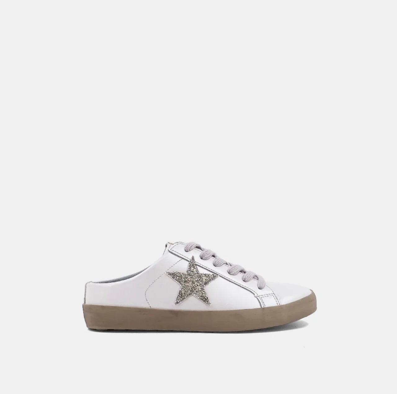 Introducing our relaxed and retro-style sneaker, POLKA. This pair comes with an open back and a classic upper made of high-quality faux white leather. The silver glitter star adds a touch of elegance to the muted yet astonishing color palette, making it perfect for styling with simple jersey dresses or track pants. Slip them on in an instant and kick them off just as quickly when you get back home.