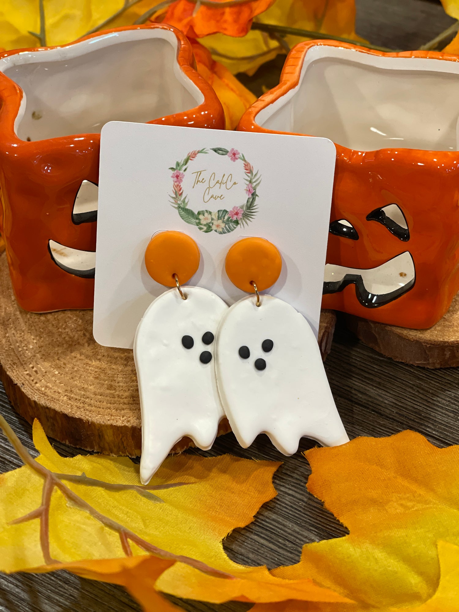 This not so scary ghost is made with clay on a post back. The perfect Halloween season accessory. It will complete any Halloween outfit you have in mind this season!