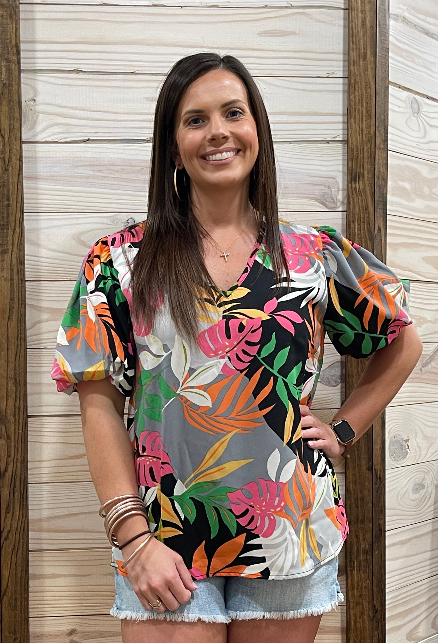 Perfect for a weekend away or tropical vacation, this lightweight bubble sleeve v-neck top is the perfect addition to your wardrobe for any and every summer occasion. Pair with denim shorts or cropped pants for a modern look you'll love!